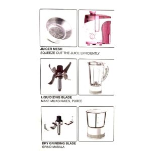 Every product is designed to make cooking a breeze,giving you more time for yourself and your family. These multi-functional machines tackle day-to-day jobs effortlessly,allowing you to do more in your kitchen. Our products are your best bet to become a master chef of your family. Powerful 500 watts,18000 rpm,Optimum speed motor,stainless steel blades,transparent liquidizing jar,,stainless steel grinder jar & chutney jar,Motor Overload Protector,Shock proof abs body,high juiceing efficient. Super efficent Centrifugal Juicer. With a 500 W motor,this mixer grinder is here to make your daily tasks of grinding and juicing easier. With a 2-in-1 functional blade,this mixer grinder can grind all varieties of dry and wet ingredients with ease. This mixer grinder comes with stainless steel 3 jars for different purposes. A grinding jar,a chutney jar and a liquidizing jar. With anti-slip and easy-grip handles,this kitchen appliance prevents spillage and makes your daily tasks easier. This kitchen appliance can be cleaned with a damp cloth or a dry one. Moreover,the stainless steel jars are washable and reusable.