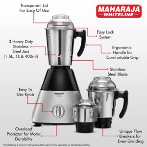 Maharaja Whiteline MX-226 Infinimax HD 1000 W Mixer Grinder (3 Jars,Black,Grey).