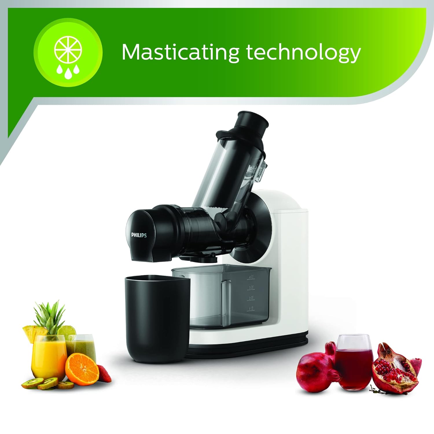 With a diameter of about 70 mm,the feeding tube of this juicer makes it convenient for you to juice almost any fruit or vegetable without any pre-cutting. Thanks to the QuickClean Technology and an easy-to-maintain micro-sieve,this masticating juicer doesn’t require much effort or time to be cleaned. It comes with an integrated drip stop that helps you keep your kitchen countertop as clean as it should be. Because most parts of this juicer are detachable,it is quite convenient to assemble and disassemble. These parts are also dishwasher-safe,so you don’t have to clean them using your hands. You can juice just about any fruit or vegetable using this juicer and retain up to 80% of its nutritional content. This appliance also acts as a great slow juicer,if you are someone who likes having his/her leafy greens juiced. You can download the Philips Healthy Drinks App and indulge in several delicious and nutritious juice recipes for free.