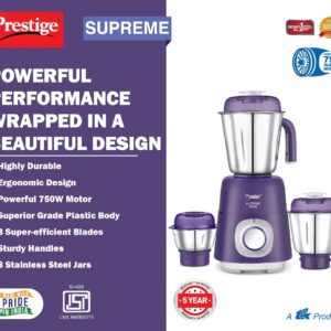 Prestige SUPREME 750 W Mixer Grinder,3 Jars (1500 ml,1200 ml,450 ml) 750 Juicer Mixer Grinder (3 Jars,Violet).