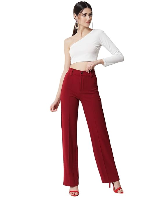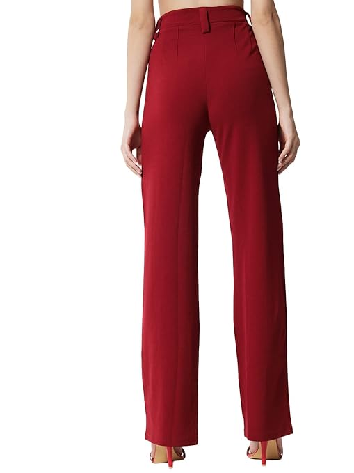 Women Polyester Solid Cherry Maroon Trousers.
